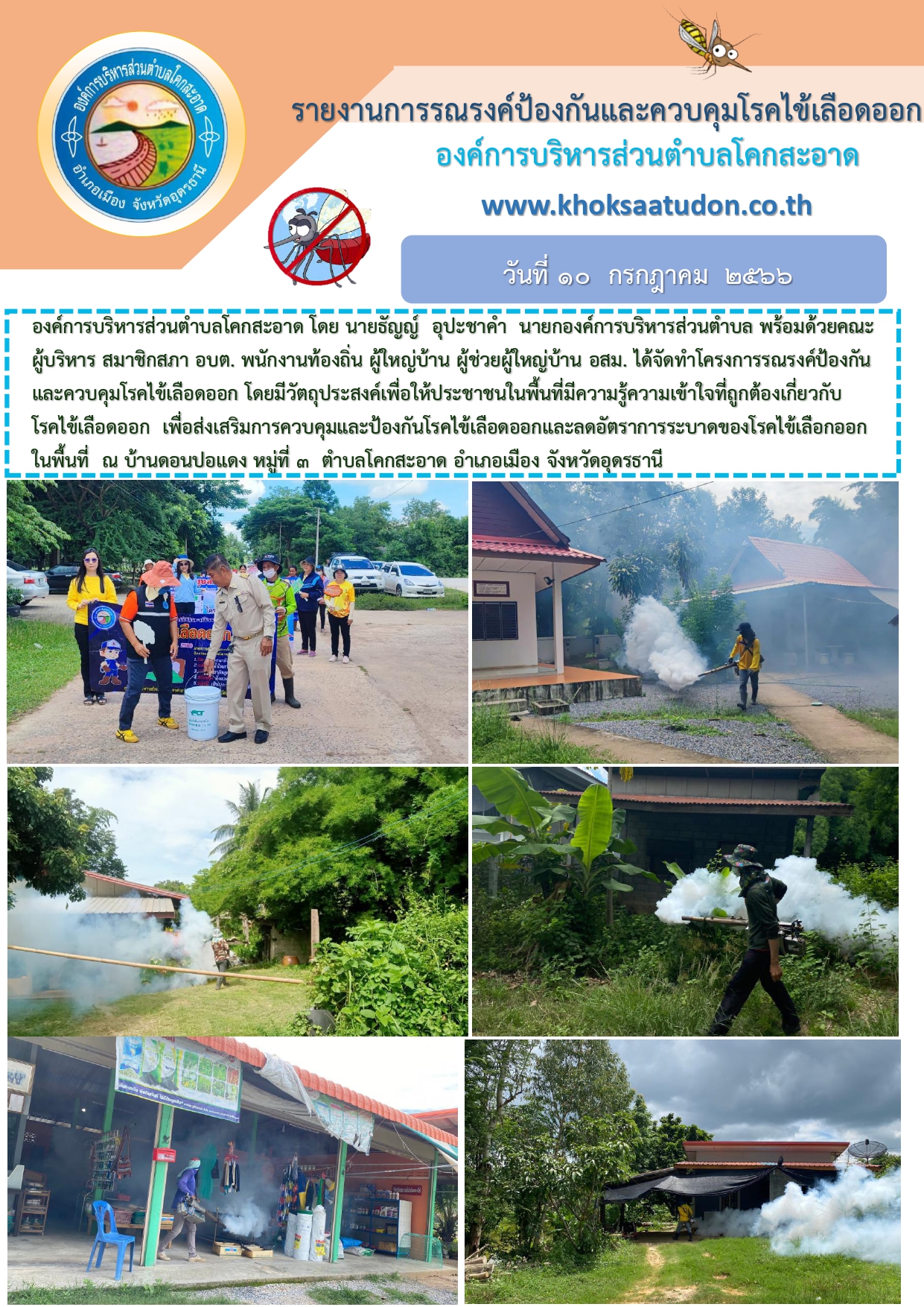รายละเอียด : องค์การบริหารส่วนตำบลโคกสะอาด โดย นายธัญญ์ อุปะชาคำ นายกองค์การบริหารส่วนตำบล พร้อมด้วยคณะผู้บริหาร สมาชิกสภาอบต. พนักงานท้องถิ่น ผู้ใหญ่บ้าน ผู้ช่วยผู้ใหญ่บ้าน อสม. ได้จัดทำโครงการรณรงค์ป้องกันและควบคุมโรคไข้เลือดออก โดยมีวัตถุประสงค์เพื่อให้ประชาชนในพื้นที่มีความรู้ความเข้าใจที่ถูกต้องเกี่ยวกับ โรคไข้เลือดออก เพื่อส่งเสริมการควบคุมและป้องกันโรคไข้เลือดออกและลดอัตราการระบาดของโรคไข้เลือกออกในพื้นที่ ณ บ้านดอนปอแดง หมู่ที่ 3 ตำบลโคกสะอาด อำเภอเมือง จังหวัดอุดรธานี