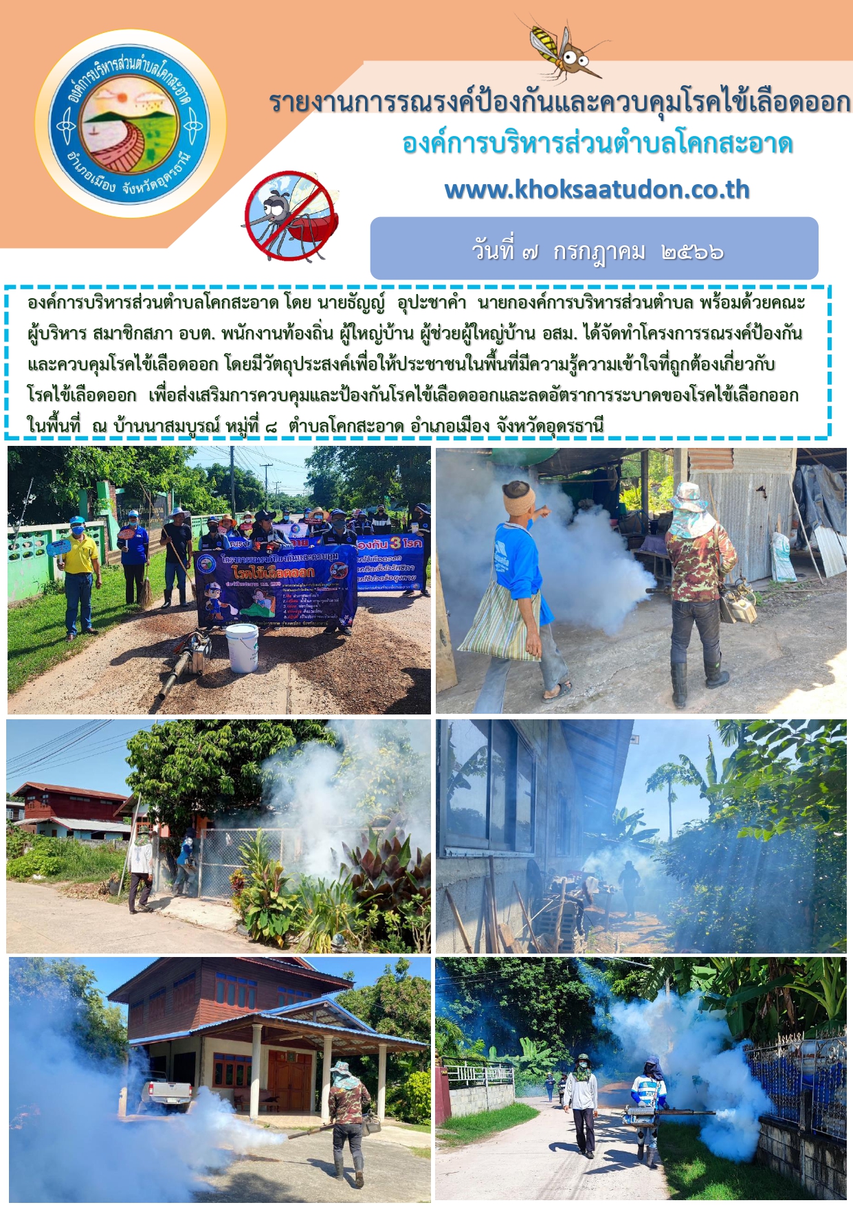 รายละเอียด : องค์การบริหารส่วนตำบลโคกสะอาด โดย นายธัญญ์ อุปะชาคำ นายกองค์การบริหารส่วนตำบล พร้อมด้วยคณะผู้บริหาร สมาชิกสภาอบต. พนักงานท้องถิ่น ผู้ใหญ่บ้าน ผู้ช่วยผู้ใหญ่บ้าน อสม. ได้จัดทำโครงการรณรงค์ป้องกันและควบคุมโรคไข้เลือดออก โดยมีวัตถุประสงค์เพื่อให้ประชาชนในพื้นที่มีความรู้ความเข้าใจที่ถูกต้องเกี่ยวกับ โรคไข้เลือดออก เพื่อส่งเสริมการควบคุมและป้องกันโรคไข้เลือดออกและลดอัตราการระบาดของโรคไข้เลือกออกในพื้นที่ ณ บ้านนาสมบูรณ์ หมู่ที่ 8 ตำบลโคกสะอาด อำเภอเมือง จังหวัดอุดรธานี